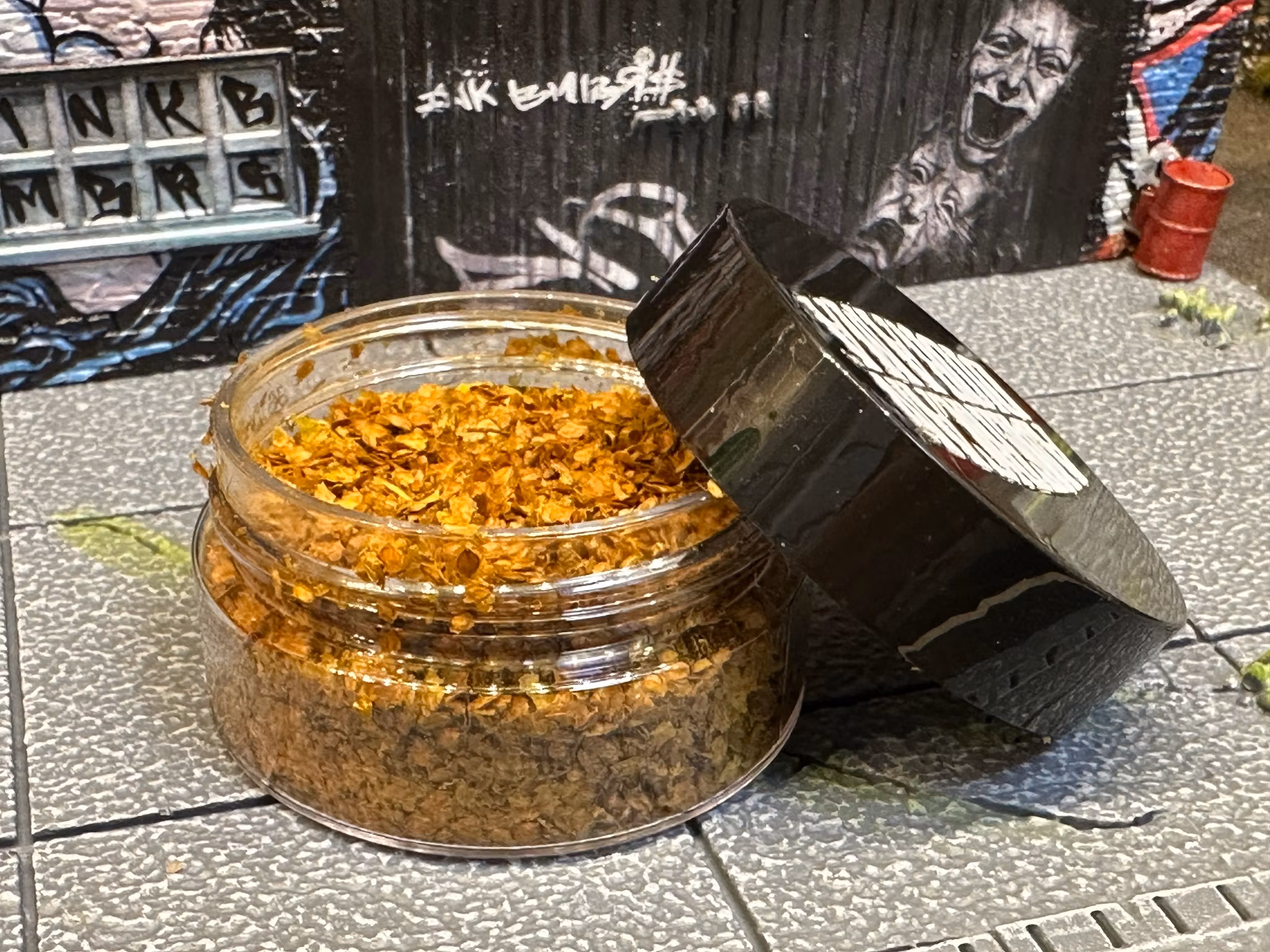 The bottom plate and the background are made of ceramic material and are just ready to put up. The small barrel holds the balance that is on the far right. You can put it so that you have a drain on your plate or you can hide it. You also get a can of dust, so that it will be really real.