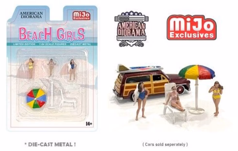 Skala 1/64 Figurer "Beach Girls" - 3 fig + Parasoll, strandstol - American Diorama MiJo