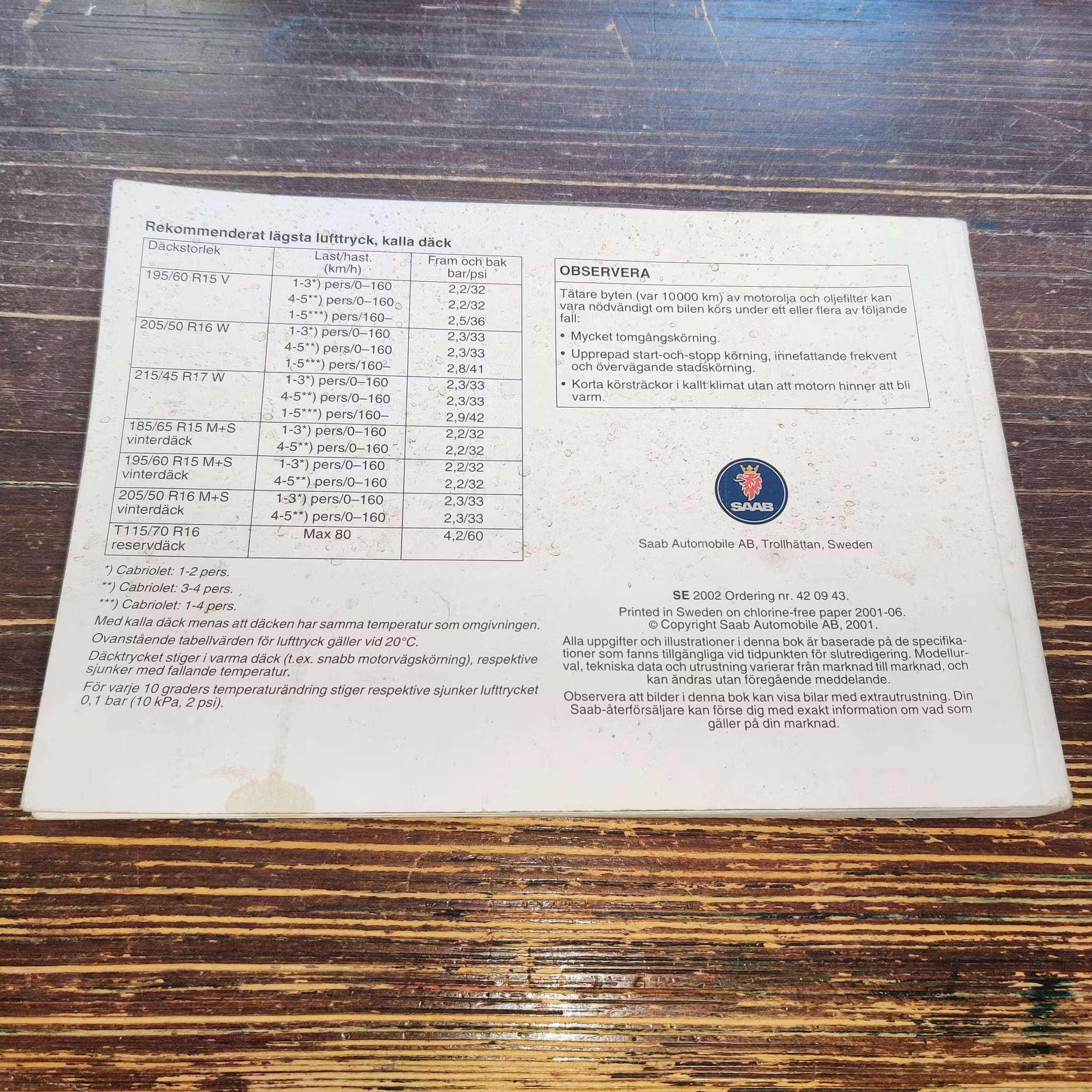 Instruktionsbok - SAAB 9-3 Tryckt 2001-06