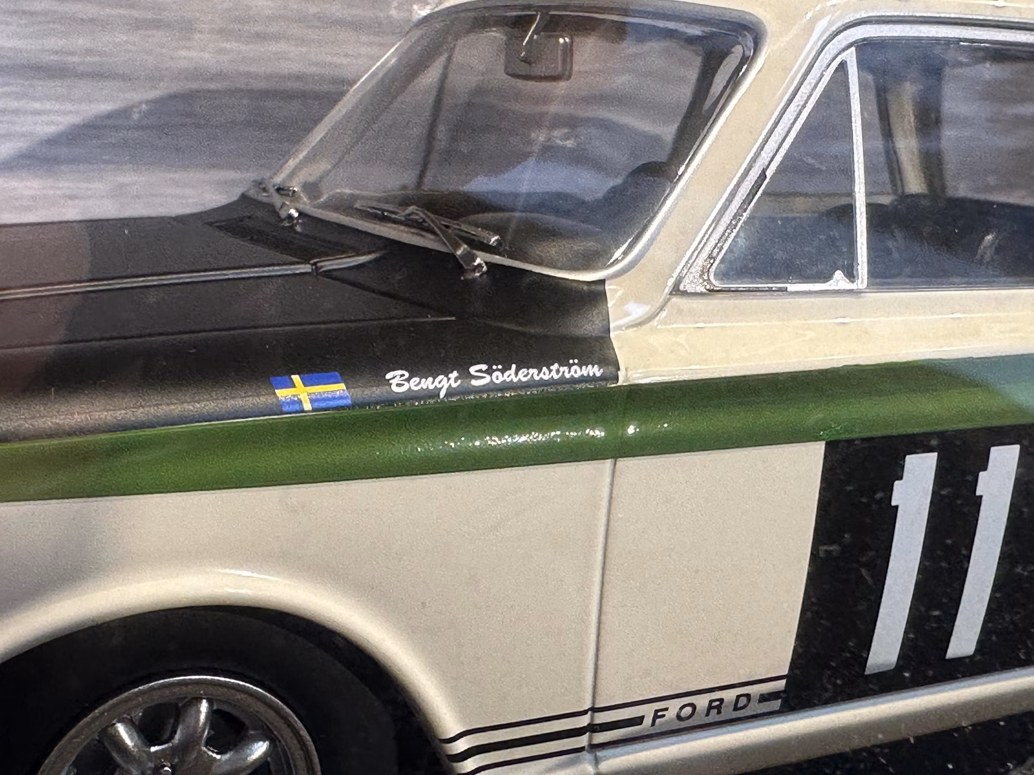 Skala 1/18 Ford Cortina Lotus White/green/Blk Bengt Söderström fr MCG/Model Car Group